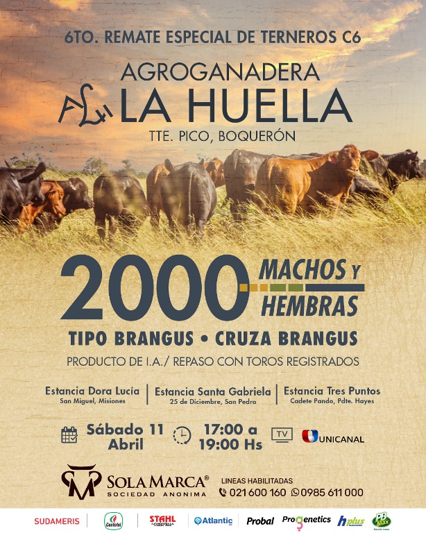 | 4 | 6907 | Estancia La Huella de AGROGANADERA LA HUELLA SA | Boquerón | Terneros Cbo 6 | 140 | 215-225 Est. | VER LOTE |